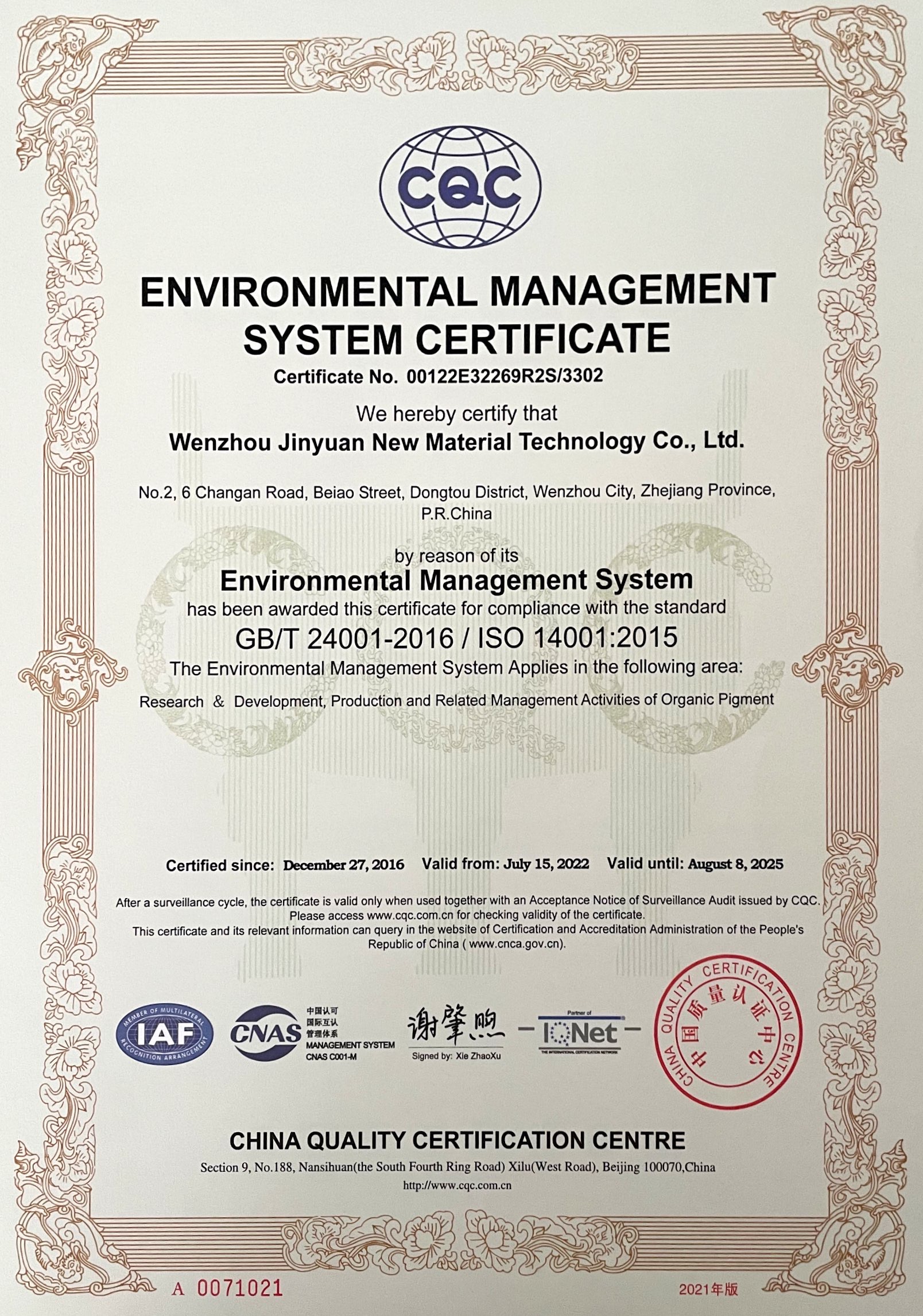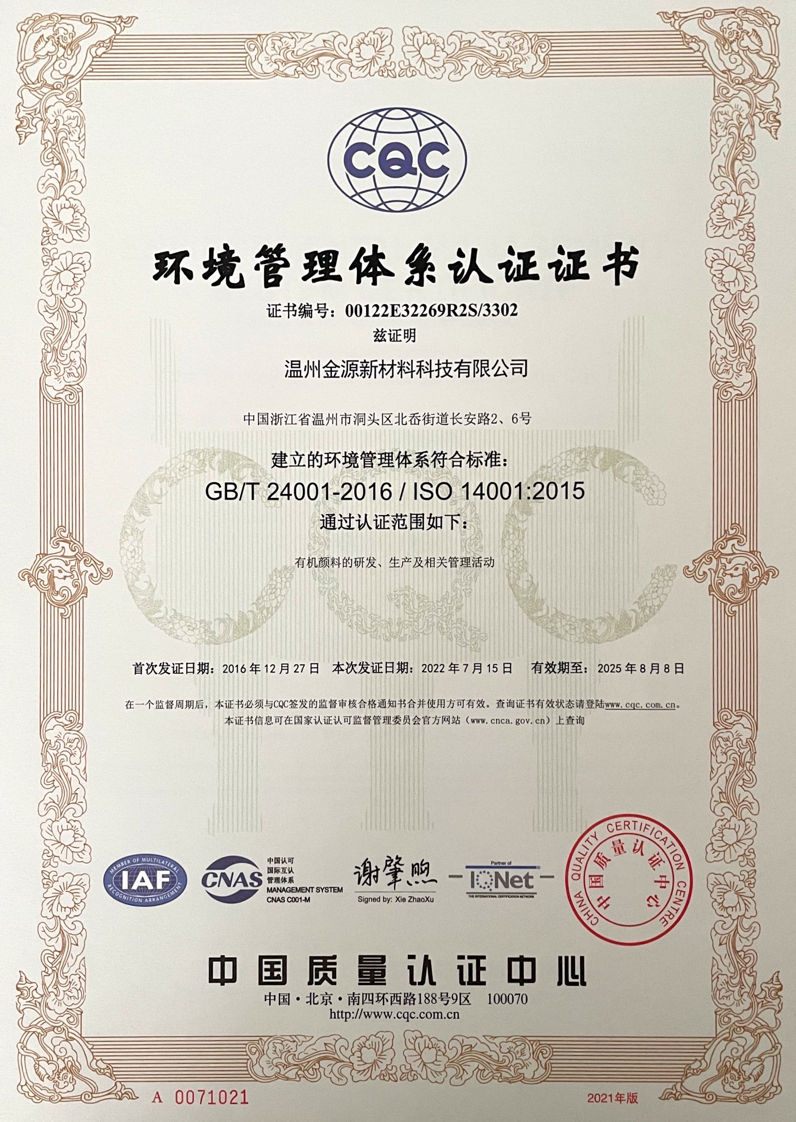 | 環(huán)境管理體系認(rèn)證證書(shū) |