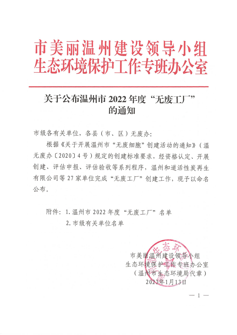 關于公布溫州市2022年度“無廢工廠”的通知